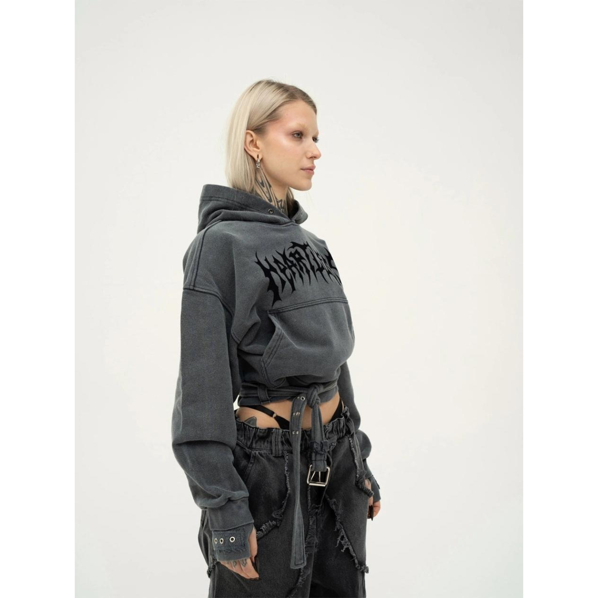 Худі з щільного котону об'ємного крою, виконане з використанням технології промислового прання для досягнення ефекту вицвілого кольору. Рукави з подвійними манжетами, а по низу виробу розташований пояс з металевою пряжкою. Худі прикрашене металевими люверсами та принтами з флоку з написом "Heartless".