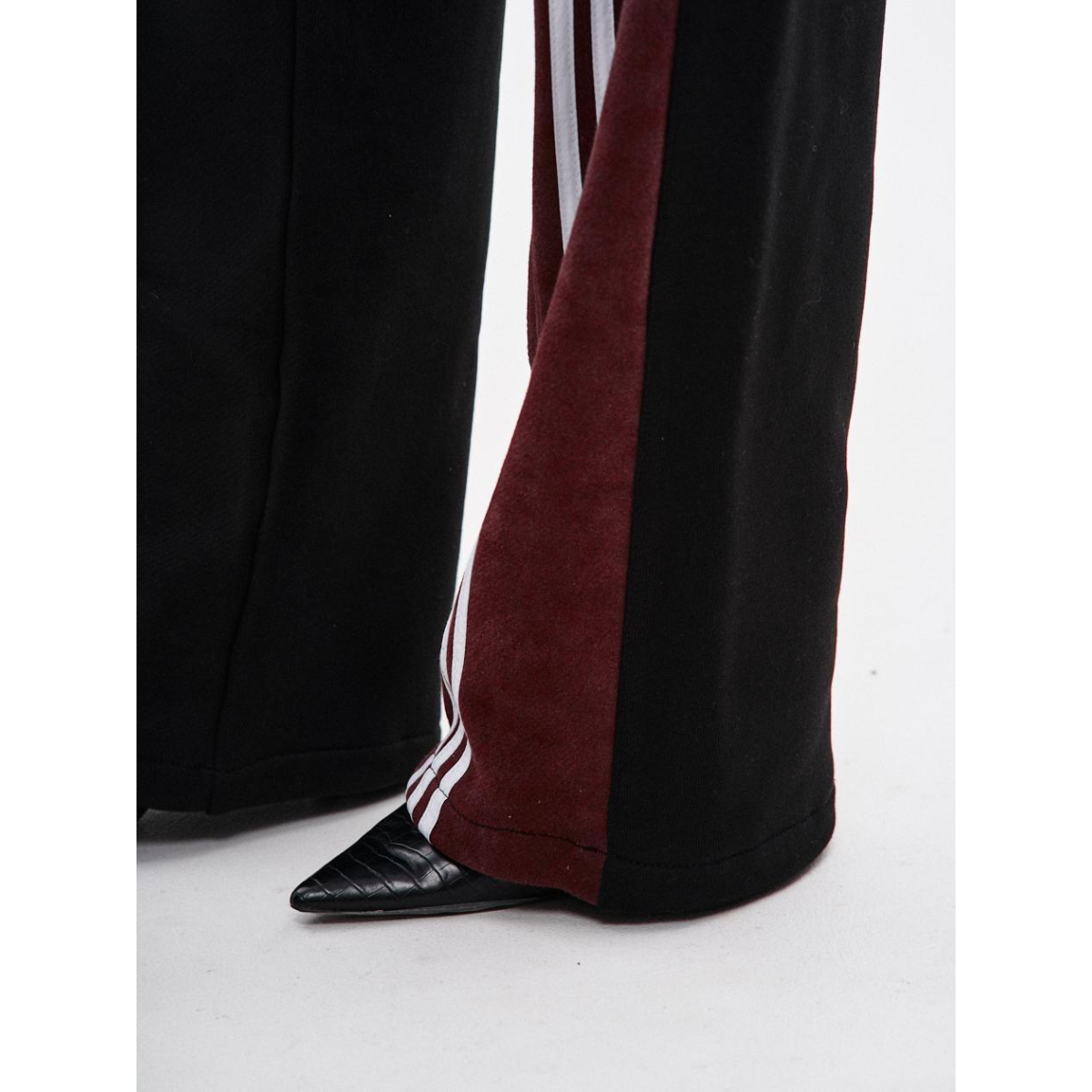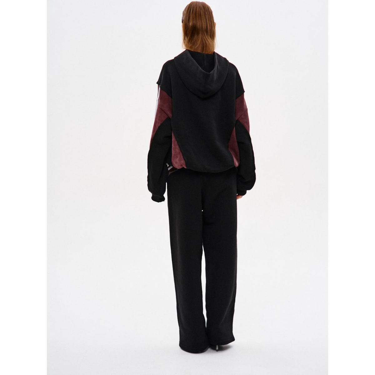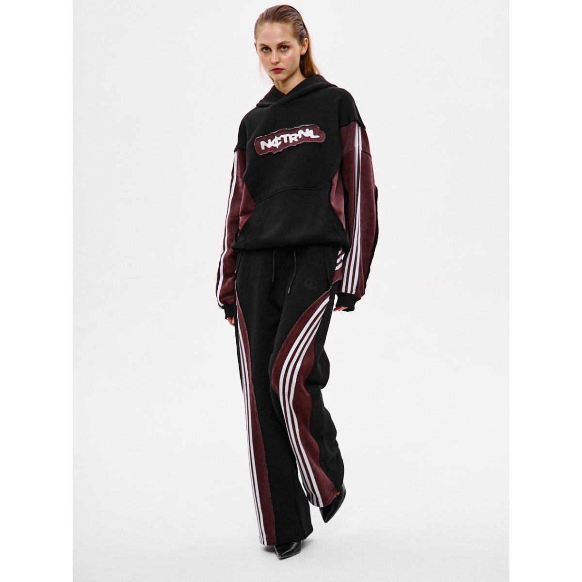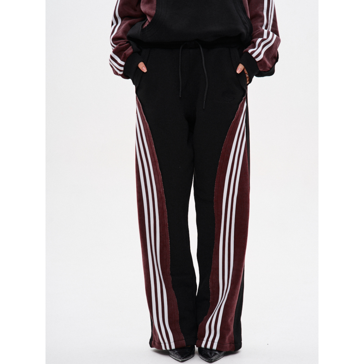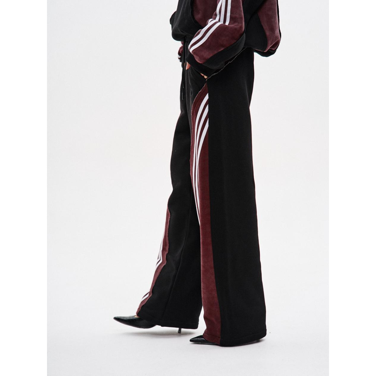 Підходить для речей, що потребують комфорту й витривалості у щоденному носінні. Ключові особливості моделі: Спортивні штани прямого крою з комбінації матеріалів у двох кольорах: основна частина — чорна, та кокетка ззаду — бордові з відкритими зрізами. На бордових деталях — по три білі лампаси з кожного боку.