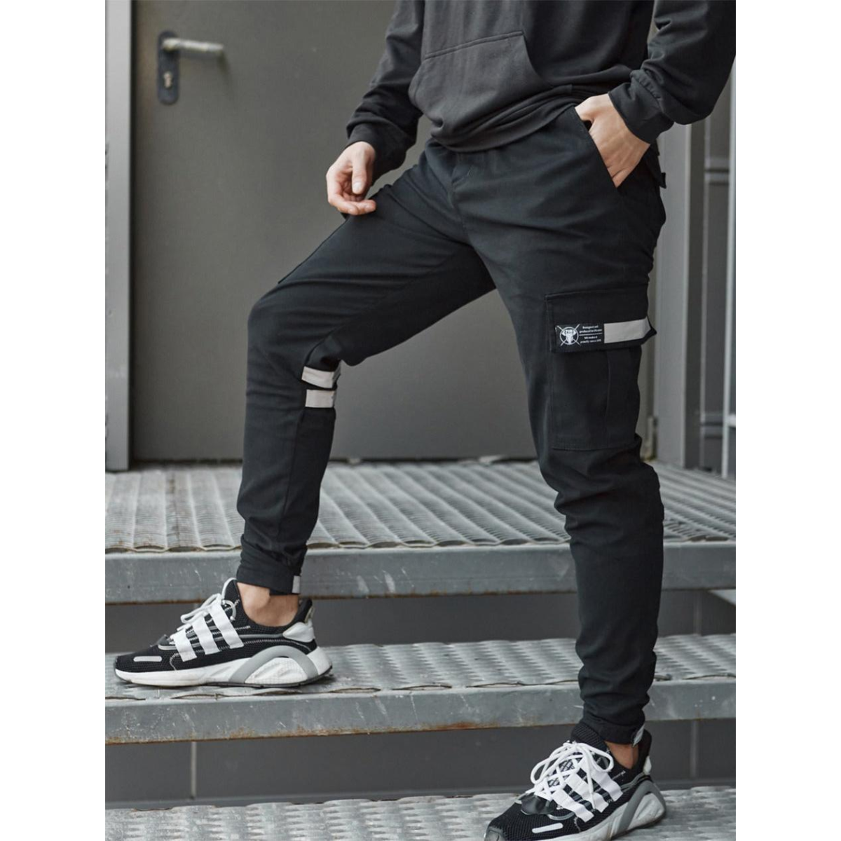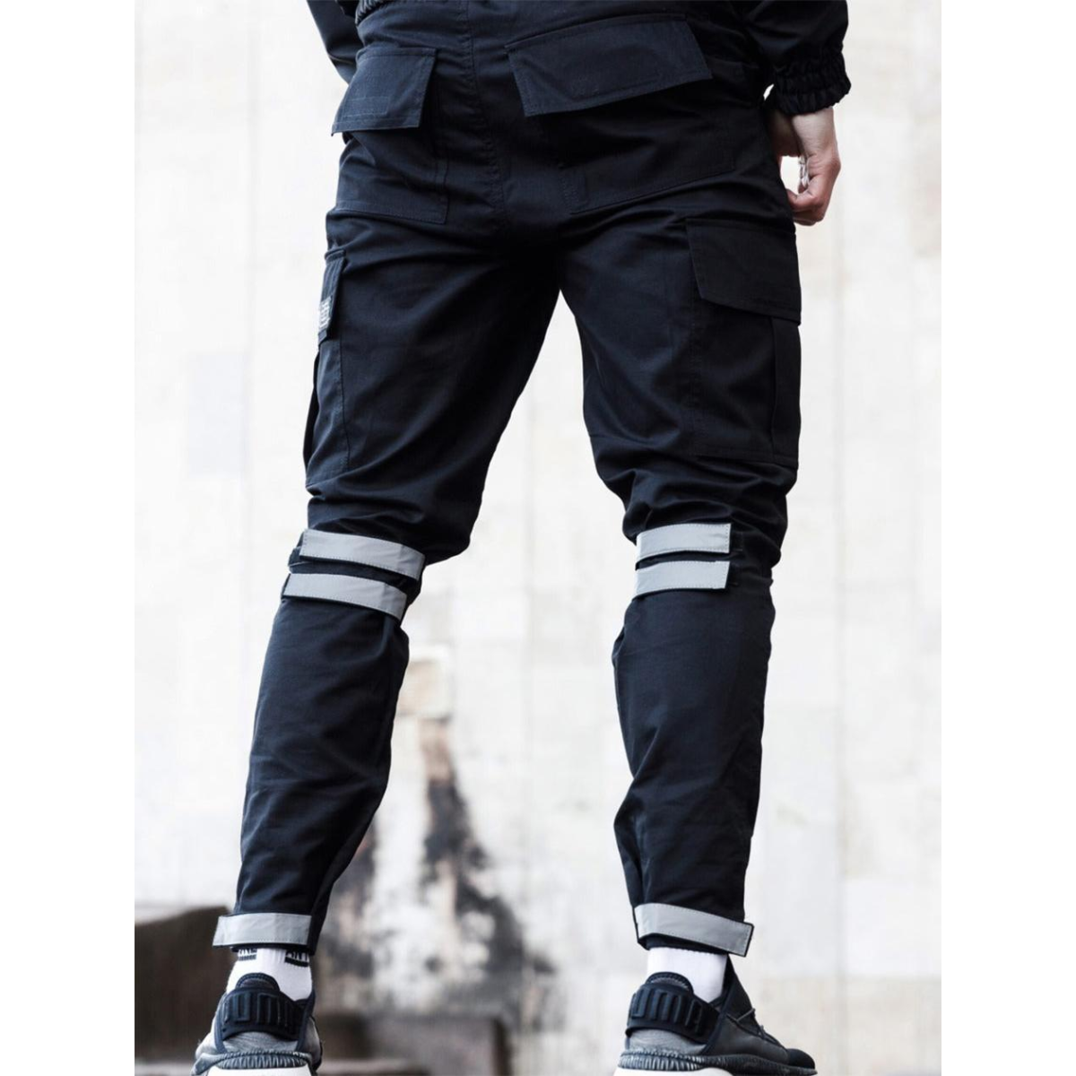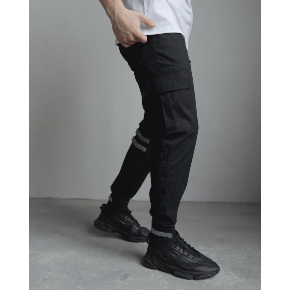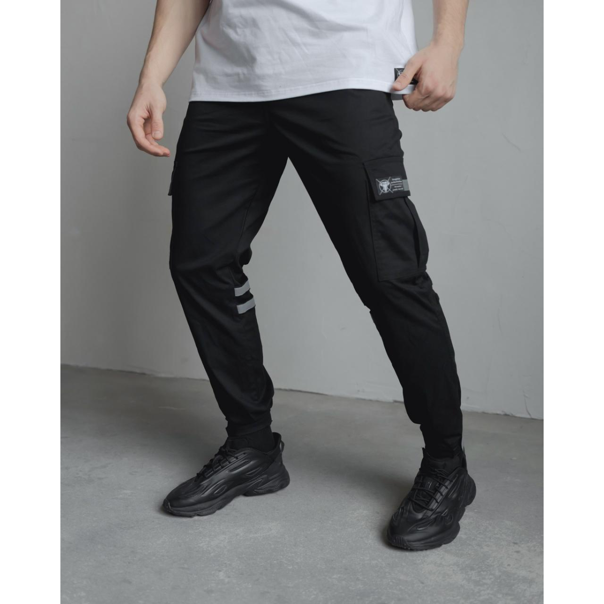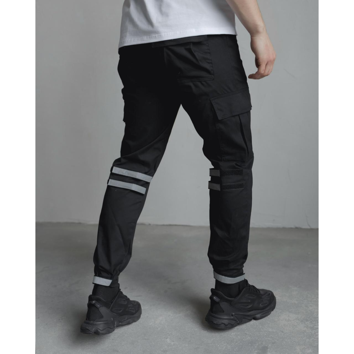 Штани класичного крою, звужені донизу — універсальний варіант для щоденного руху. Пояс на резинці зі шнурком забезпечує комфортну посадку. Ширина штанин регулюється в зоні колін і внизу за допомогою ліпучок з рефлективними вставками — естетика та функція в одному рішенні.